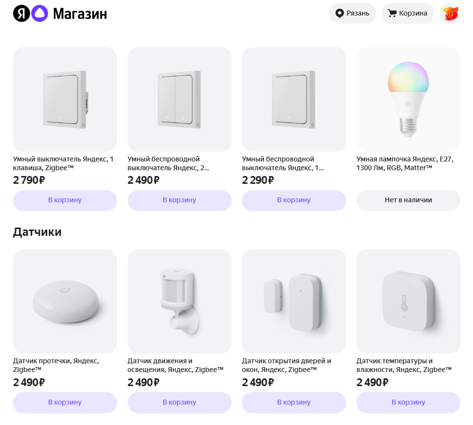 Магазин Алисы содержит все актуальные модели умных устройств. Девайсы разделены на категории: Станции, освещение, датчики, хабы и пульты, розетки и телевизоры.